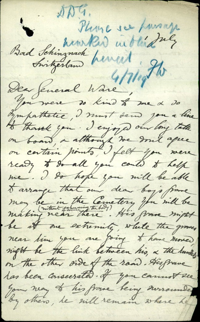 “I enjoyed our long talk on board, & although we don’t agree on certain points, I felt you were ready to do all you could to help me…..Don’t be afraid, because you have been good enough to let me buy the grave, that in a few years it will be unvisited & uncared for. I am proud to think my influence will have taught my children & grand children to love that spot, & that for many many years to come that grave will be cared for & tended by loving hands”