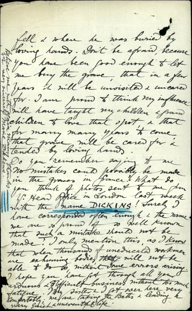 Marie Dickens was determined that her son’s body should not be moved, and in February 1919 made a personal visit to the War Office to inform them that she would make arrangements to purchase the site of his grave. She then made several visits to the IWGC to ensure her wishes were understood, meeting Fabian Ware on a number of occasions.