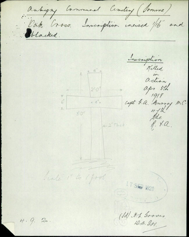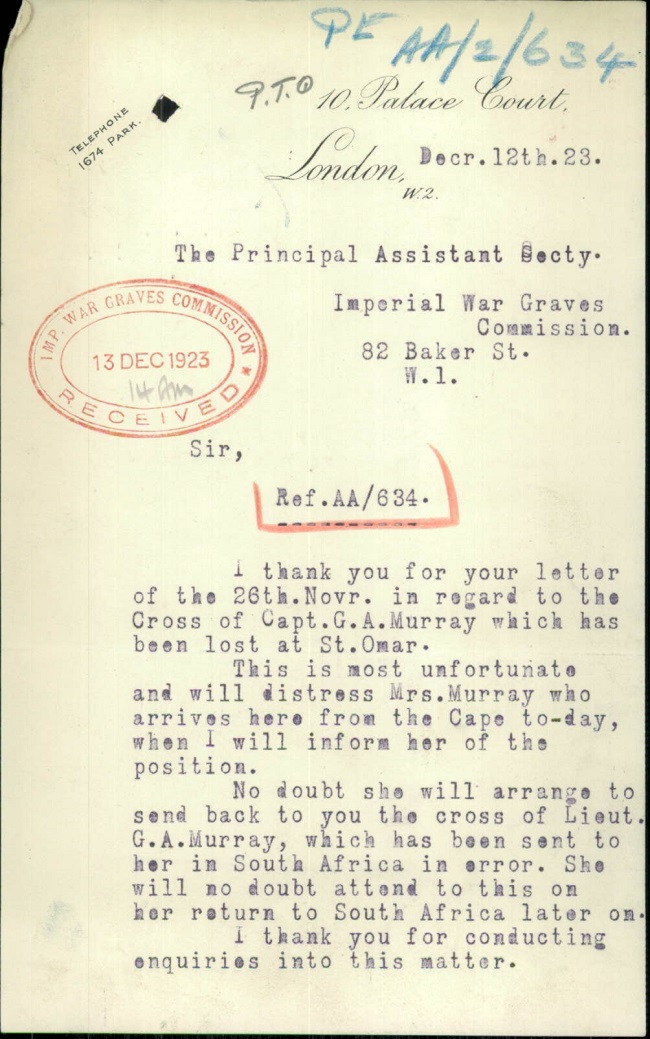 Unfortunately, as the Commission were informed by Margaret’s father, P.A. Molteno, MP, the wrong cross had been delivered, that of Lieutenant G.A. Murray, Royal Engineers, who was buried in Marcoing Communal Cemetery. In spite of exhaustive enquiries, George’s cross, which had been lost in transport from Albert to St. Omer, could no longer be traced. The family were distressed and deeply disappointed to hear this news.