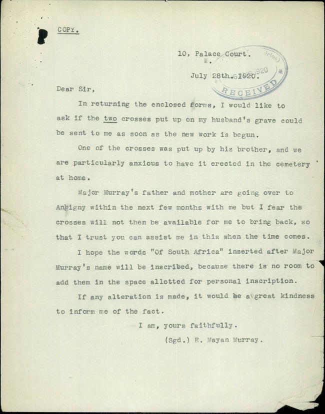 Correspondence between Margaret and the IWGC continued in the years that followed. In July 1920 she wrote to the Commission requesting that the words ‘Of South Africa’ be added to George’s headstone and that the wooden cross originally marking his grave, erected by his brother, be returned to the family in South Africa. While the addition of a personal inscription was easily arranged, the return of the wooden cross proved more difficult.