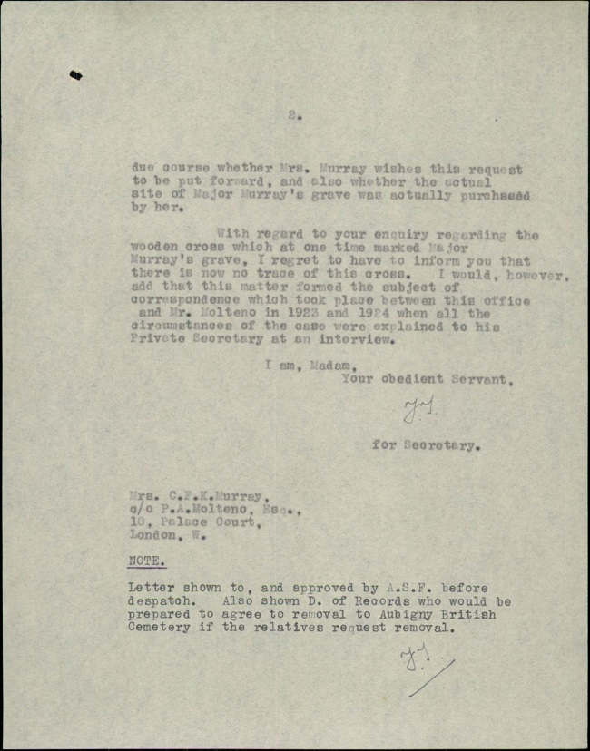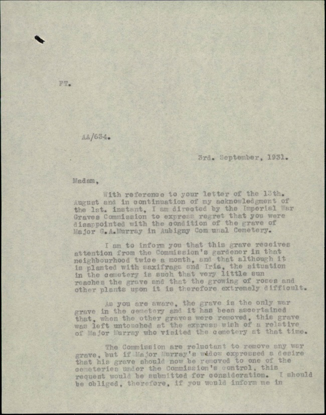 In 1931, following a visit to her son’s grave in Aubigny Communal Cemetery, Caroline Murray wrote to the IWGC expressing her displeasure with the condition of the cemetery, and reminded the IWGC of their past error involving the cross. Despite being the lone war grave in the cemetery, the Commission gardener was tending to the grave and planting flowers twice a month. The poor appearance was a consequence of the grave’s unfortunate position within the cemetery where little sun was received.