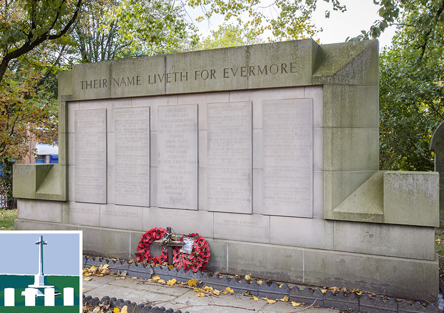 At Birmingham Warstone Lane Cemetery and the nearby Birmingham Key Hill Cemetery the Commonwealth War Graves Commission commemorates over 110 Commonwealth servicemen of the World Wars, most on screen wall war memorials.