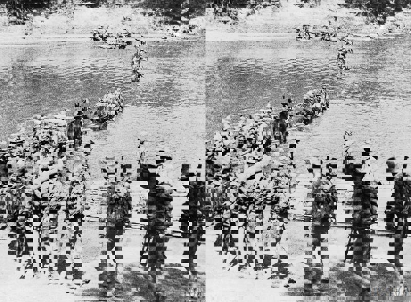 Chindits of the Long Range Penetration Group wade through a deep Burmese river (© IWM)