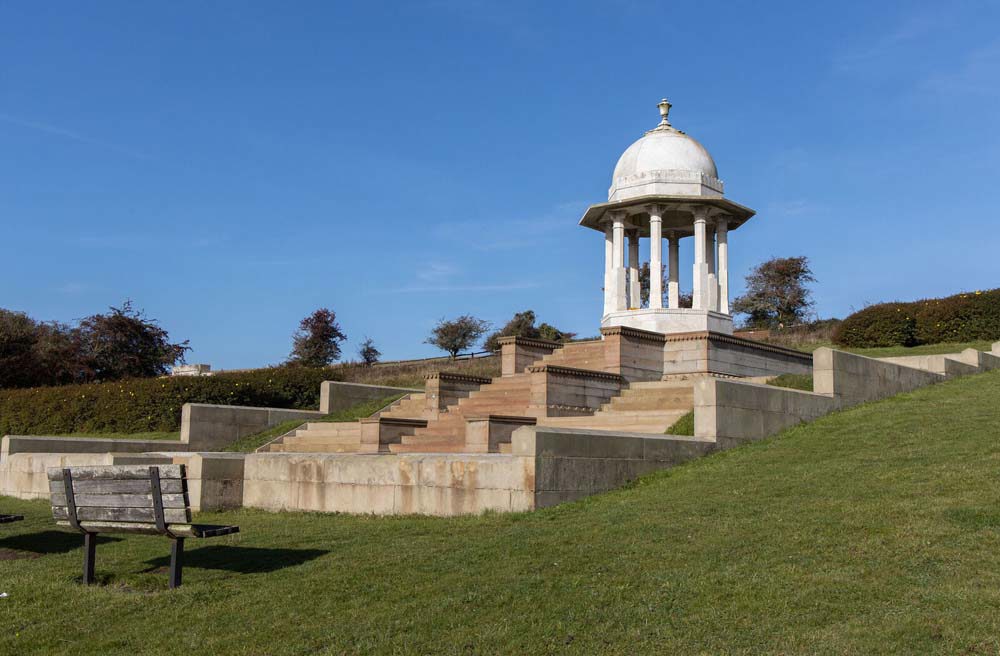 This WW1 memorial takes the form of a sanctuary enclosed within a circular wall after the manner of the enclosing railings of early Indian shrines. The column in the foreground of the enclosure stands almost 15 feet high and was inspired by the famous inscribed columns erected by Emperor Ashoka throughout India in the 3rd century BC.