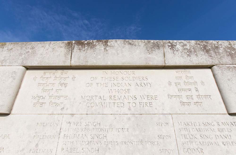 The Patcham Down Indian Forces Cremation Memorial bears an inscription written in Hindi, Punjabi and English that reads:
