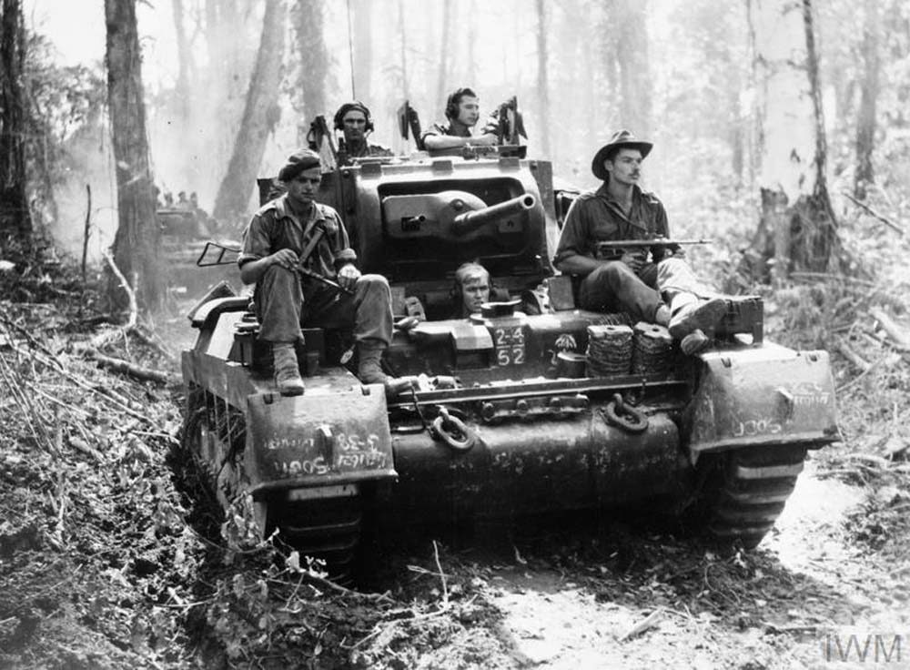 Australian soldiers hitch ride aboard a tank deep in the jungles of the Solomon Islands (© IWM HU 69099)