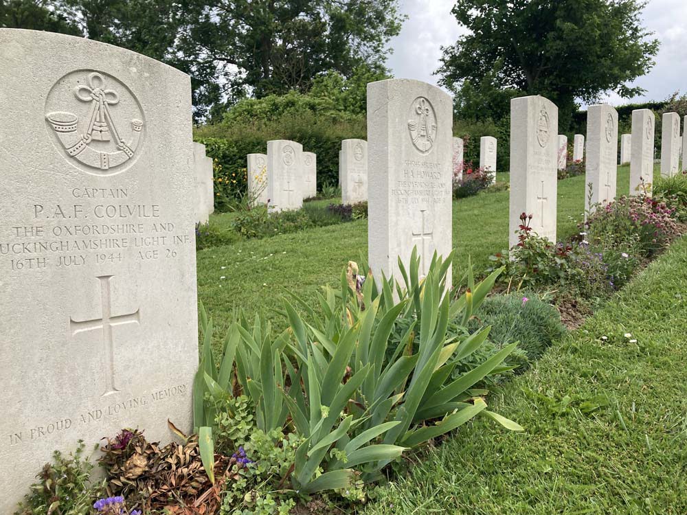 “When you visit, you will see many headstones in Plot III bearing the stringed bugle horn of the Oxford and Bucks Light Infantry. 81 soldiers of the 1st Battalion Ox and Bucks are buried here, 50 of whom died on a single day, 16 July 1944, one small part of the heavy fighting of June-July when Commonwealth forces attempted to encircle Caen to the south.”