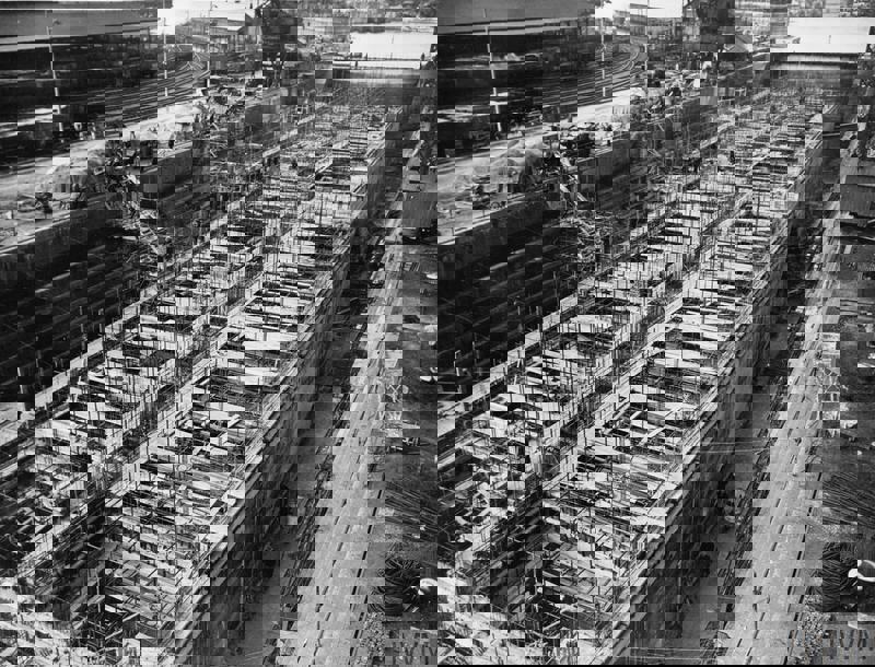 Part of the massive Mulberry floating harbour under construction in a Southampton fabrication yard (© IWM A 25792)