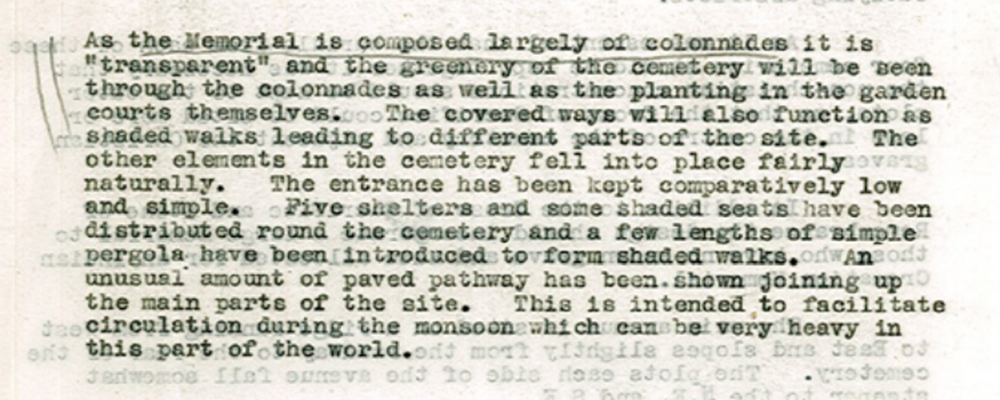 Often, the architect’s own experiences would dictate the material used. H. J. Brown, who worked on CWGC sites across India, Pakistan and Burma after the Second World War, provided a detailed set of notes alongside his architectural plans for Taukkyan War Cemetery and Rangoon Memorial stating: