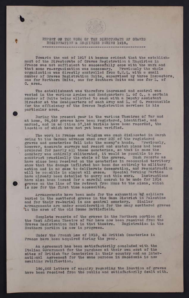 The duties of the Directorate of Grave Registration and Enquiries and the Commission began to overlap in 1918 but the DGRE was still focussed on its core mission: marking and registering war graves.