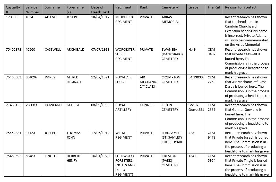 We wish to make contact with any family members of the casualties concerned in the document attached.