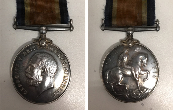 The silver medal bears the face of King George V on one side and a depiction of St George on horseback with the dates 1914 - 1918 on the other.