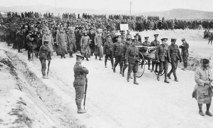 Funeral procession of Mrs. Harley (sister of Lord French) who was killed by a shell at Monastir, Salonika, March 1917. © IWM (Q 32782)