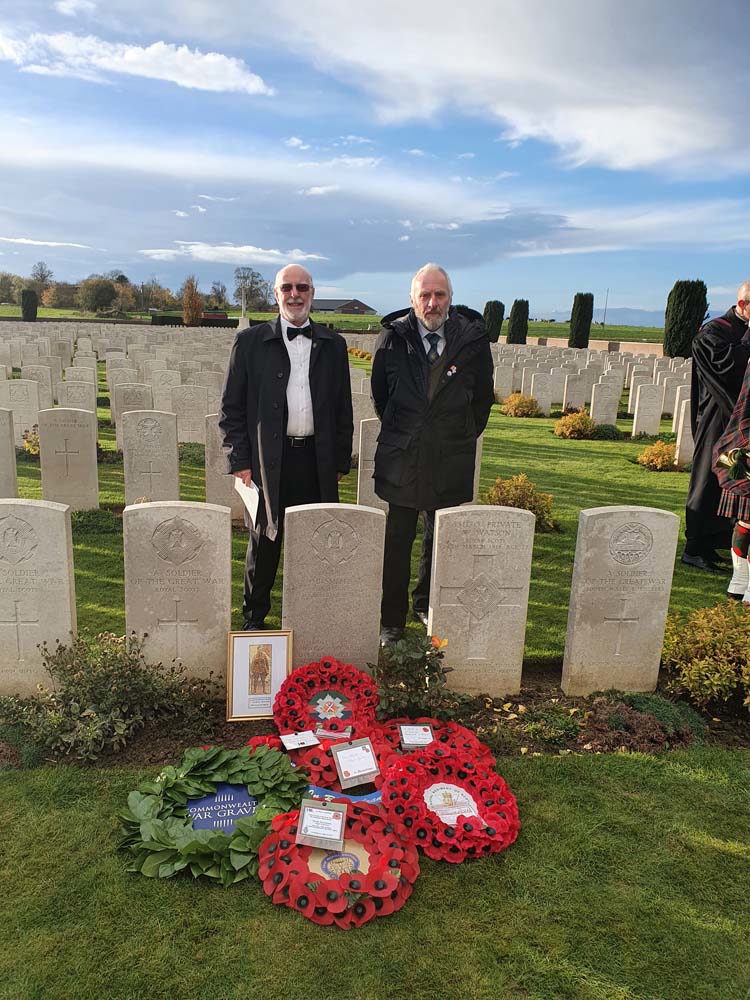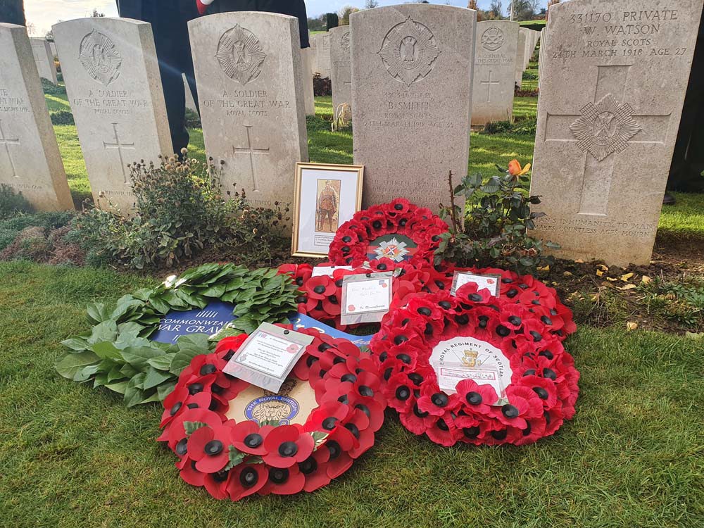 The graves of Private (Pte) James McNeilage McLean, age 24 and Lance Corporal (LCpl) Brunton Smith, age 35, who were killed at different stages of the First World War in Northern France, have been rededicated more than a hundred years after they died. Both men served with regiments that are now antecedent to The Royal Regiment of Scotland.