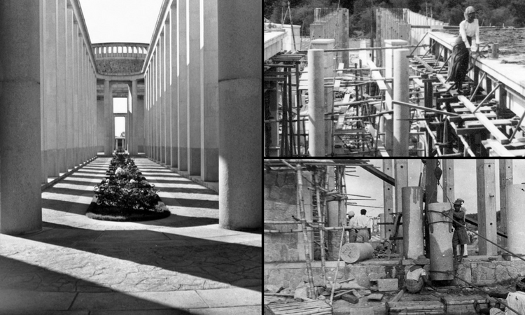 Rangoon Memorial in 1960 (left), and construction of the memorial in 1957 (right)