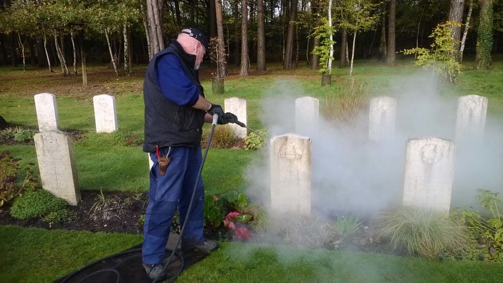 Excessive cleaning can damage stonework as it opens pores in the stone to allow more rapid greening up of the stonework. Steam cleaning can also kill or damage the plants and grass in front of the headstones and memorials.