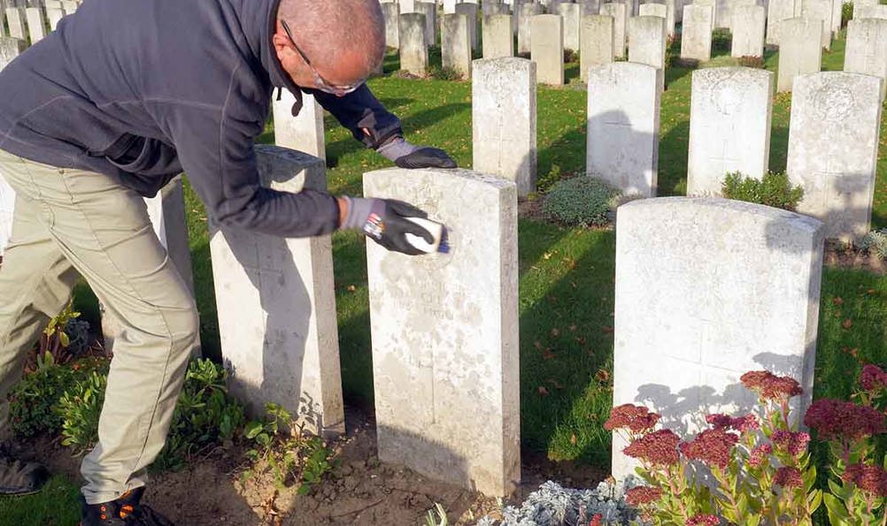 All headstones in the Ypres Salient were treated with an enzyme-based product. Biocides were carefully and selectively reintroduced at badly affected sites as a short-term measure, with appropriate permissions in Belgium and in severely affected cemeteries in France. We continue to constantly monitor the condition of all our headstones.