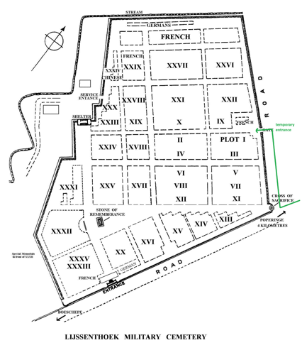 The only concentration burials were 24 added to Plot XXXI in 1920 from isolated positions near Poperinghe and 17 added to Plot XXXII from St. Denijs Churchyard in 1981.